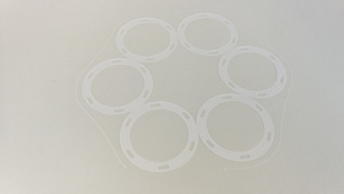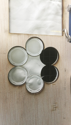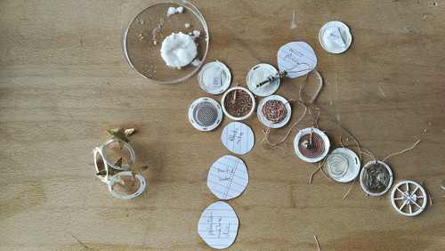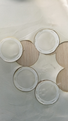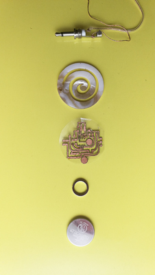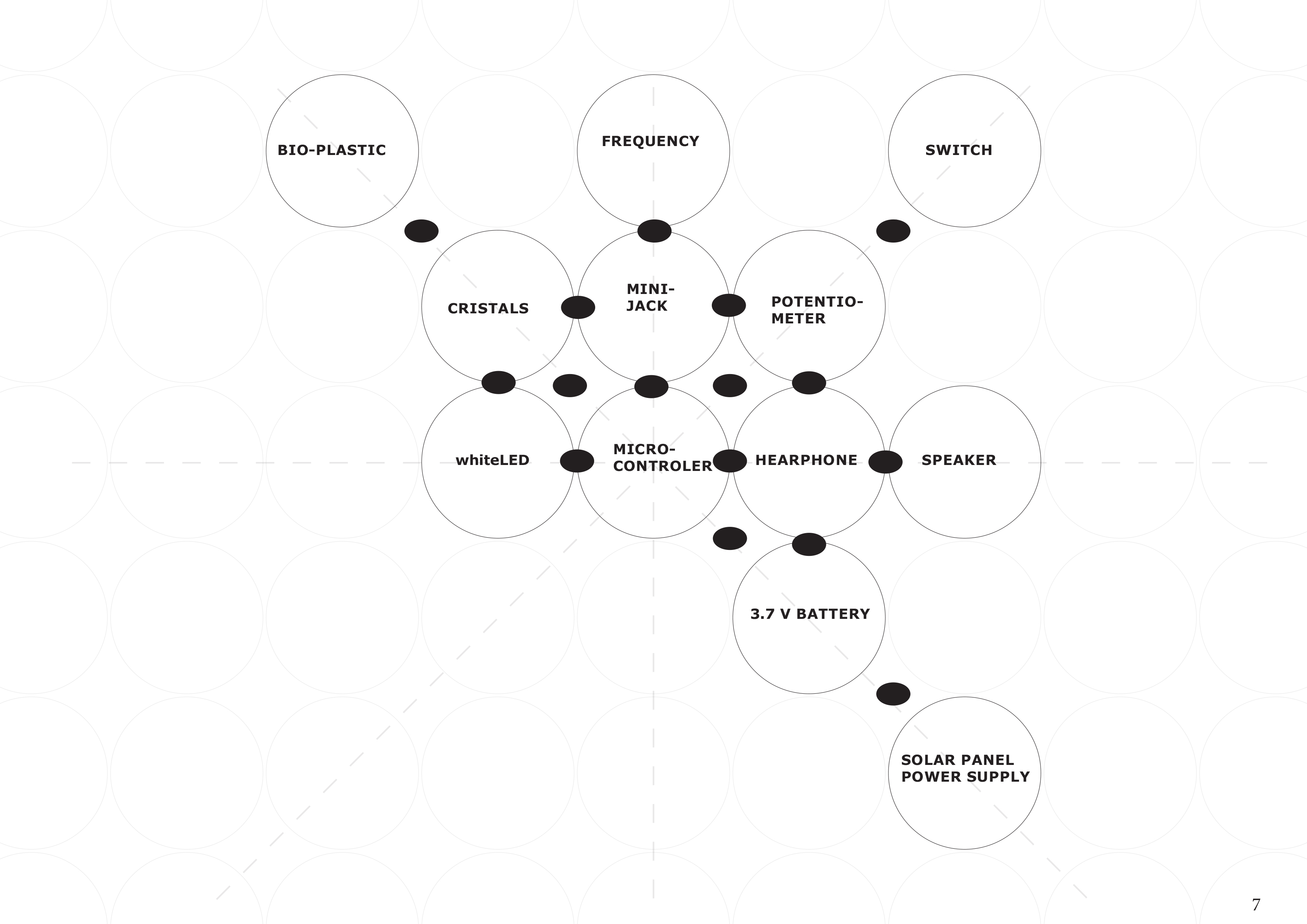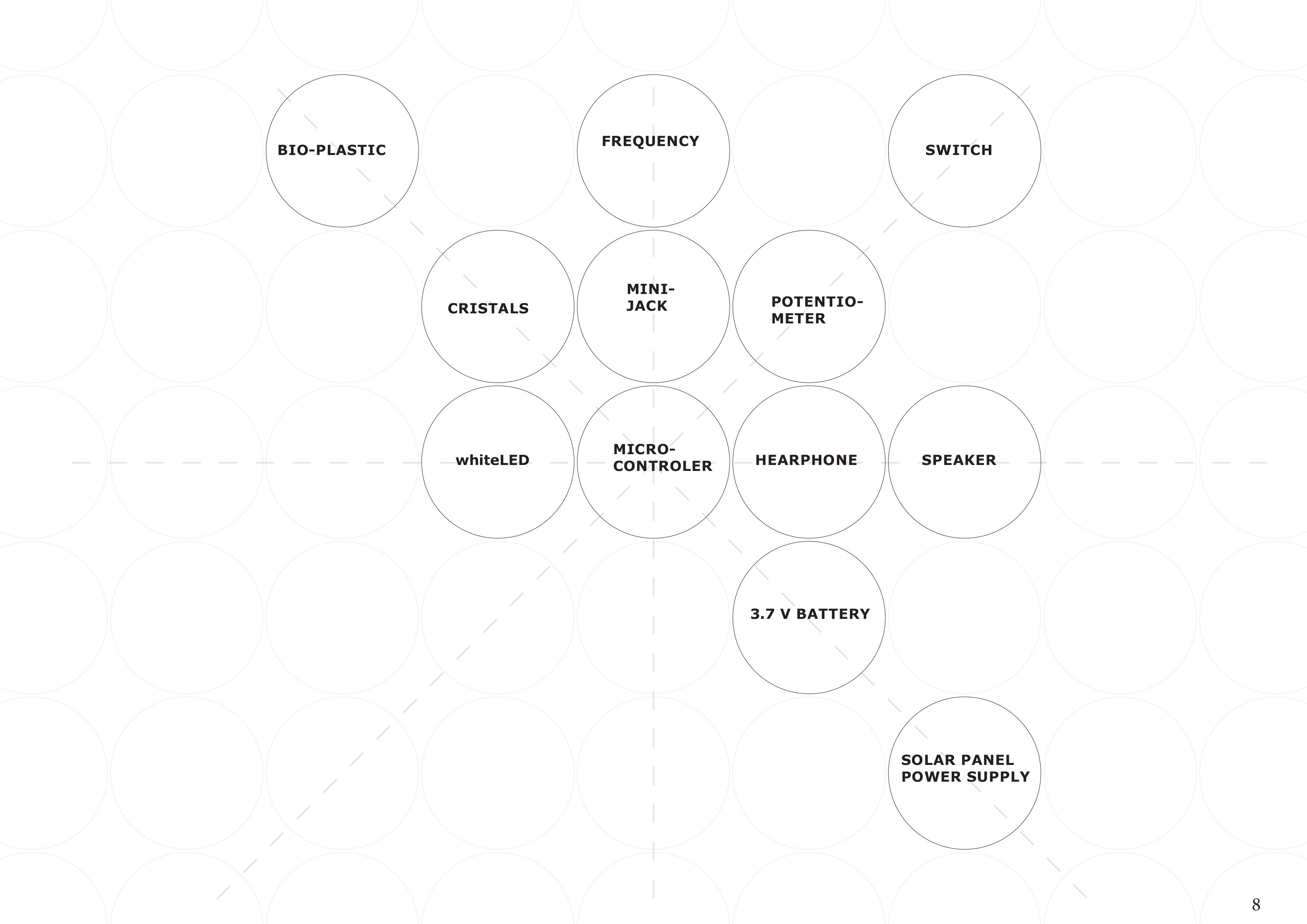 Modular map pattern with differents part of the project. In the center the multilayered circuit material device. Each circle is a different compenent to make the whole device. Each circle have a function in the devise, you can change different part.