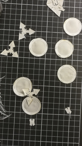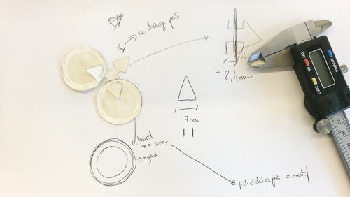 This design (video gold and PLA circles) is too complicated, I think the circles and the triangular pattern is too complicated with the other shape and materiality I will make for the potentiometer, the circuit and the LED.