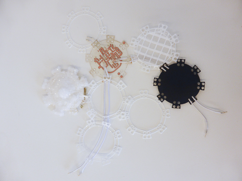 Those material are 3D printed on textile like second hand textiles wastes to put differents materials and different module of the device (speaker, battery, light…).