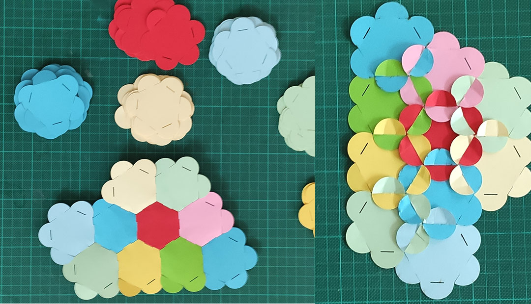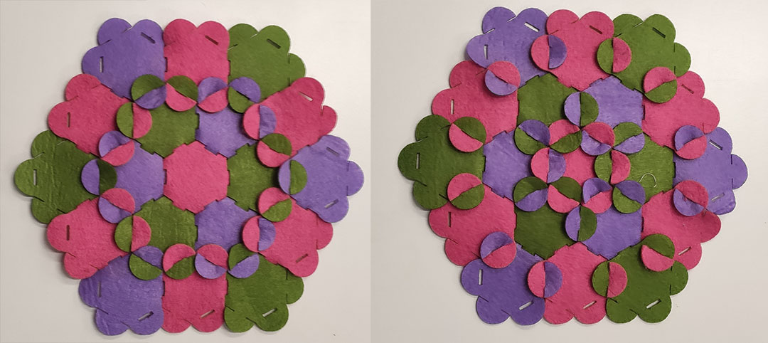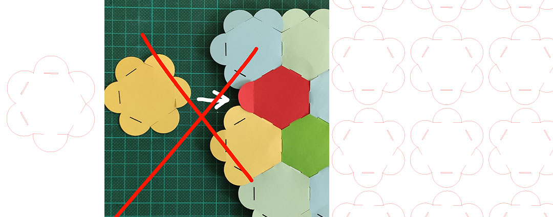 Then I discovered that the repartition of the male ou female connector was not working all the time, so I had to redo the design, to set alternatively the connector In fact the pattern on the left has a symetry on the middle of the shape which doesn't allow me to built in any direction, so by swaping the male and the female connector I change the symetry to be a 120 degree of rotation.
