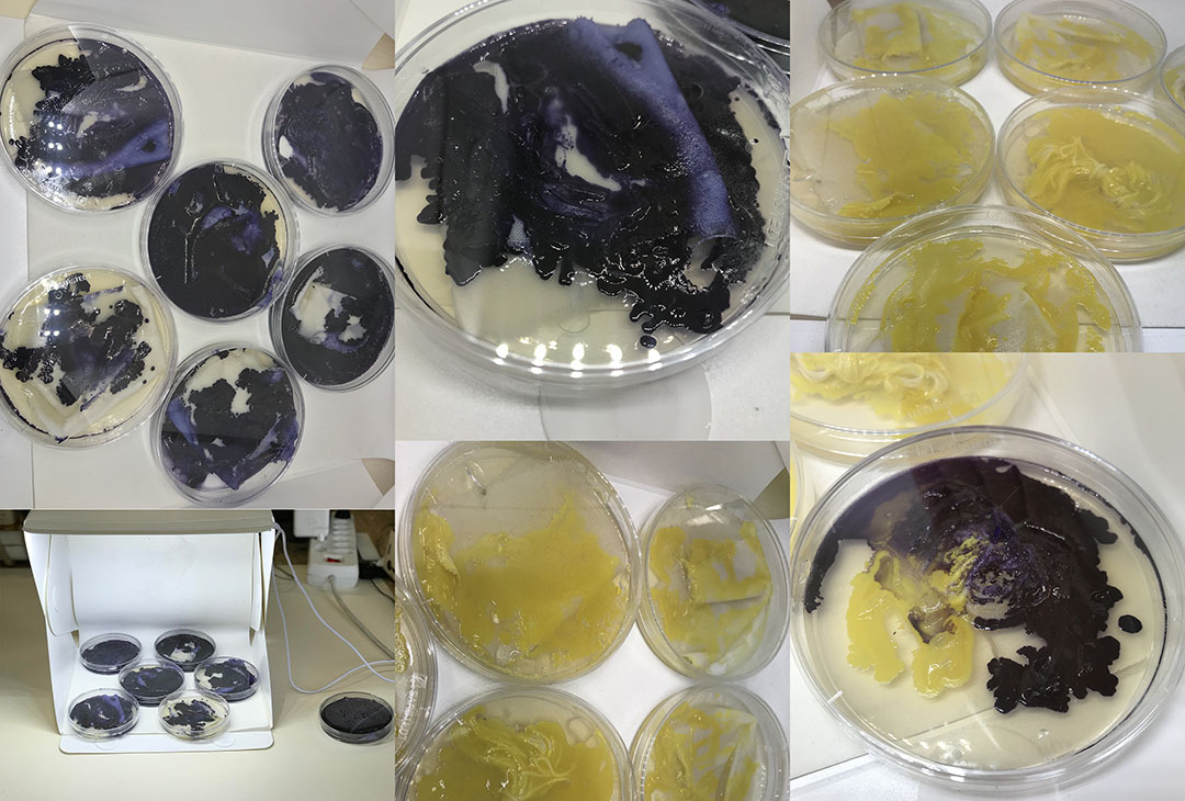 After the clean up of the coton pieces, we can say that the Micrococcus luteus (yellow) was not working so much: the color was not intense and was not really fixed on the support. On the other hand Janthinobacterium lividum (purple) was working well and I like the marble effect.