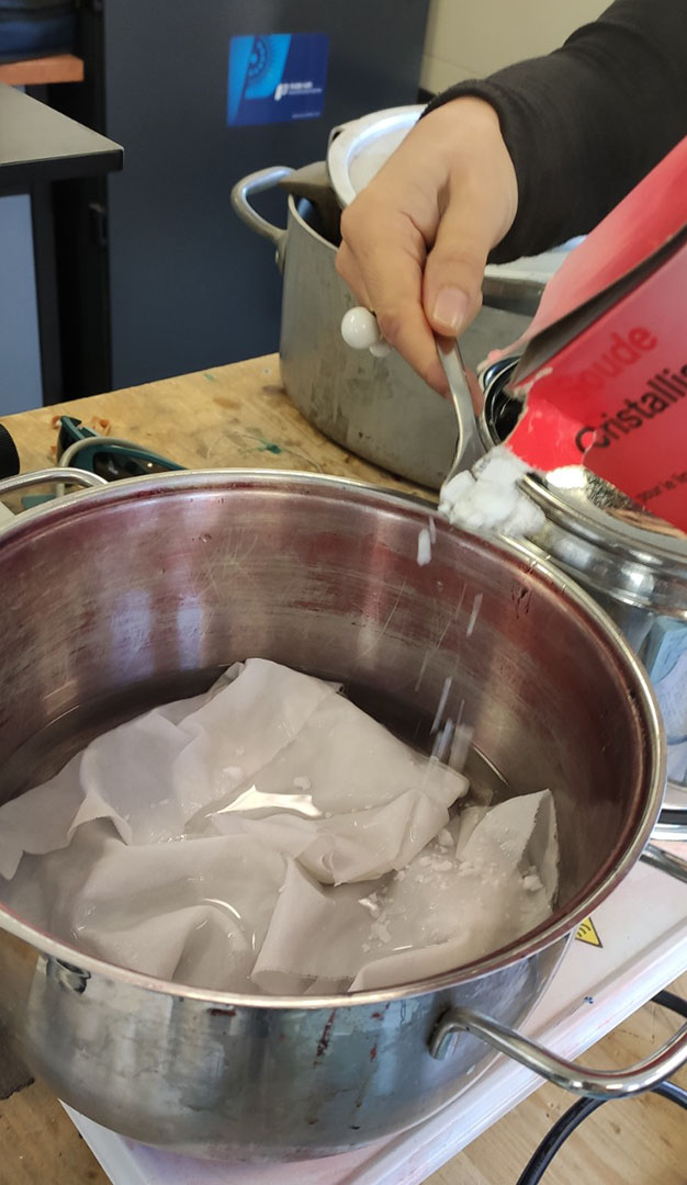 Vegetal Fiber(Cotton): Boil the fibers for an hour in water and sodium carbonate (soda ash) ±2 spoons for 4 liter water. This process will remove the oil and waxes that are naturally presentin the fibers. It’s good to repeat this process twice or to start by washing the fibers at a high temperature in the washing machine.