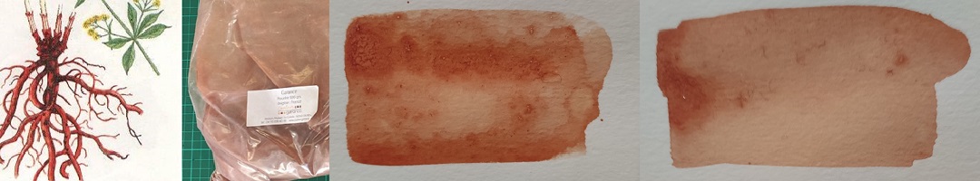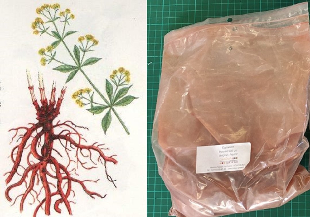 The pigment is extracted from the roots of the plant, here we have it in powder.