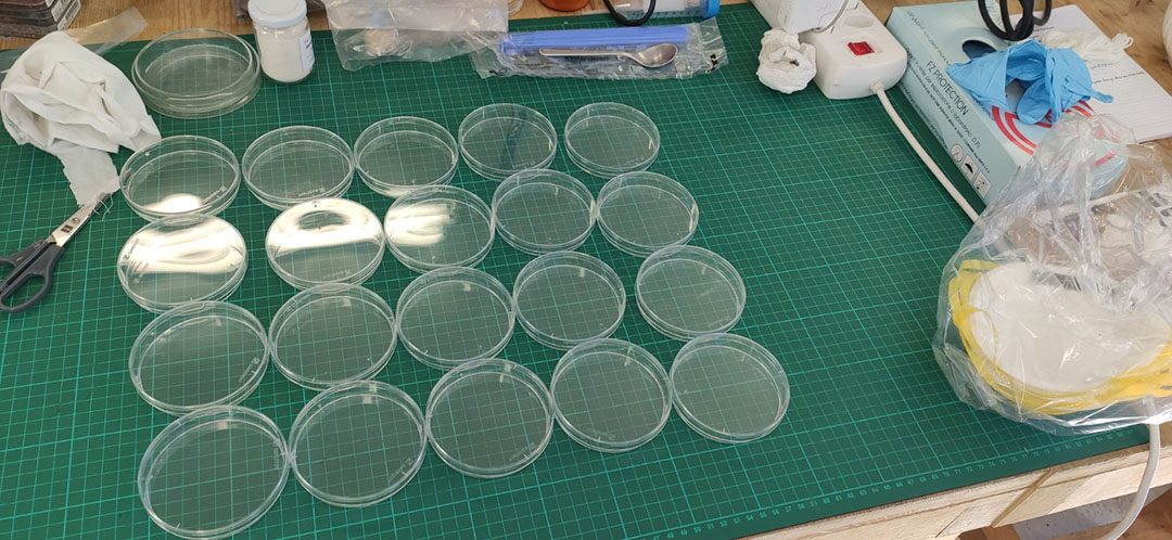We have 20 Petri Dishes in a sealed bag, Let's prepare 20 piece of material (coton & wool) and the nutriment for the bacterias then put them in the "autoclave"