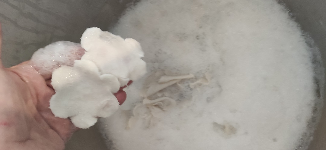 So I redo the whole process with pattern pieces :here the thickness of the coton is big so I will clean them up with hot water and soap , then with soda , then applied the mordant
