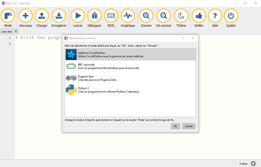 The first time you start Mu, you will be prompted to select your 'mode' - you can always change your mind later. For now please select Adafruit!