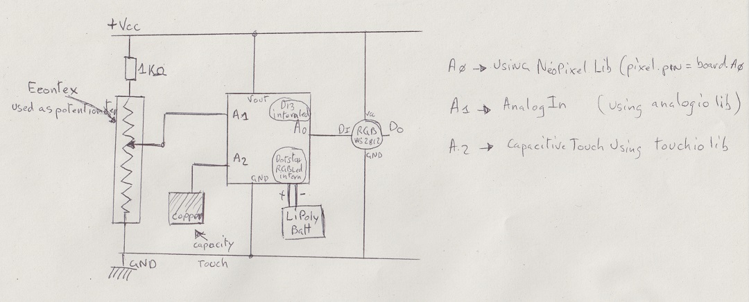 A2 as a capacitive touch sensor using a copper textile A1 as an Analog Input using the eoontex as a potentiomer to create value between 0..255 A0 as an Output to pilot a Flora RGB Smart NeoPixel
