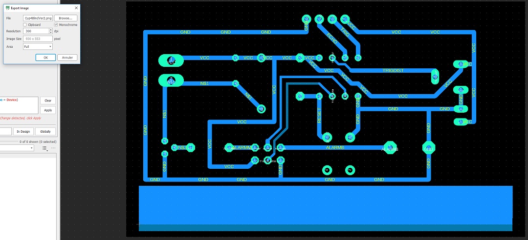 then you obtain this pict (here in JPG rather than PNG because of the space) from which with a basic graphic editor you can create one file for trace, one for holes and one for the cutting of the PCB