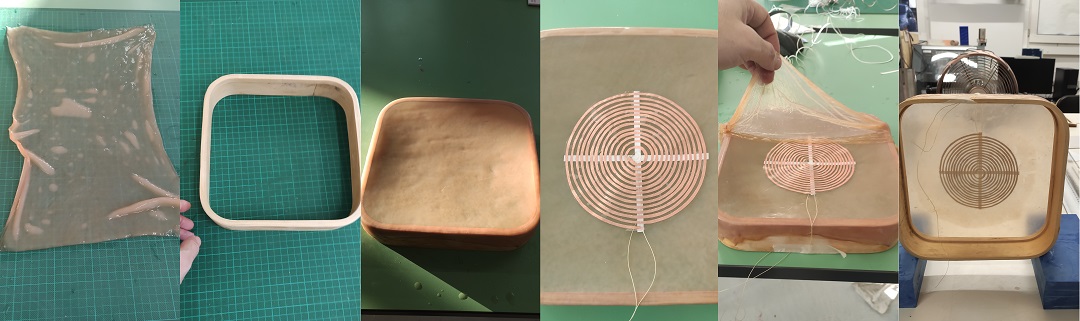 I used a wood frame coming from a broken IKEA clock found in the street. I applied the first layer of Kombucha with a little bit of tension, then let it dry. After 4 hours I put the copper frame cut with vinyl cutter.