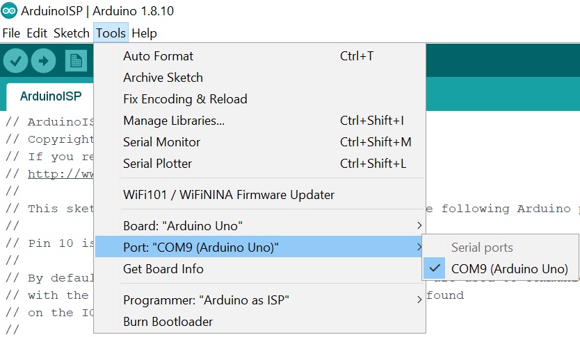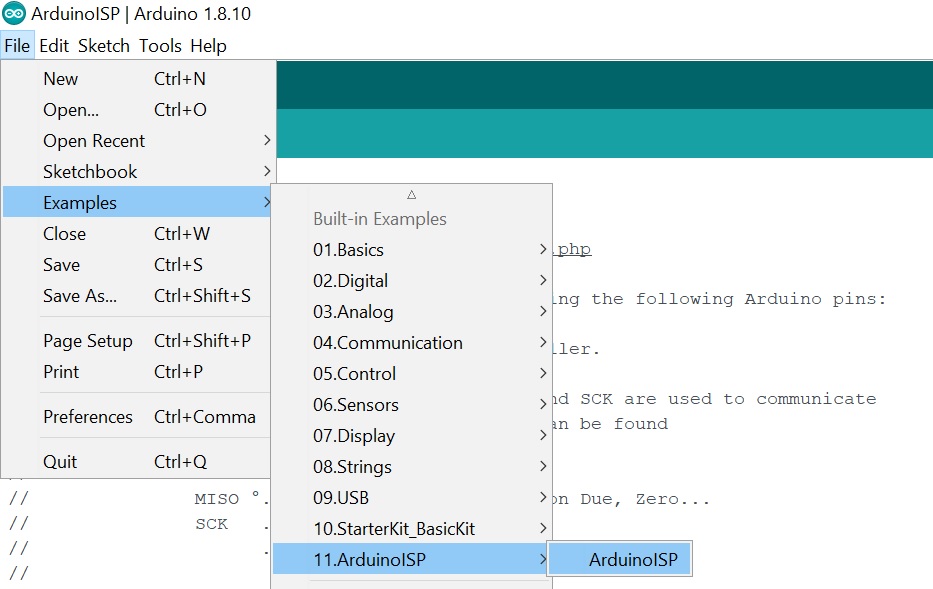 - Plug the arduino UNO and in Arduino IDE go to Files --> Examples --> 11.ArduinoISP