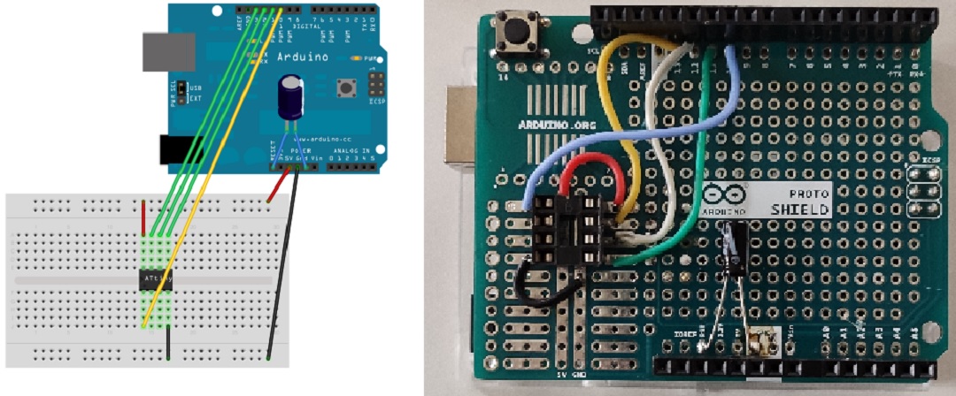 The following picture show you how to make the connexion between Arduino UNO and Tiny45/85 using a BreadBoard For My Lab I Made it permanently.