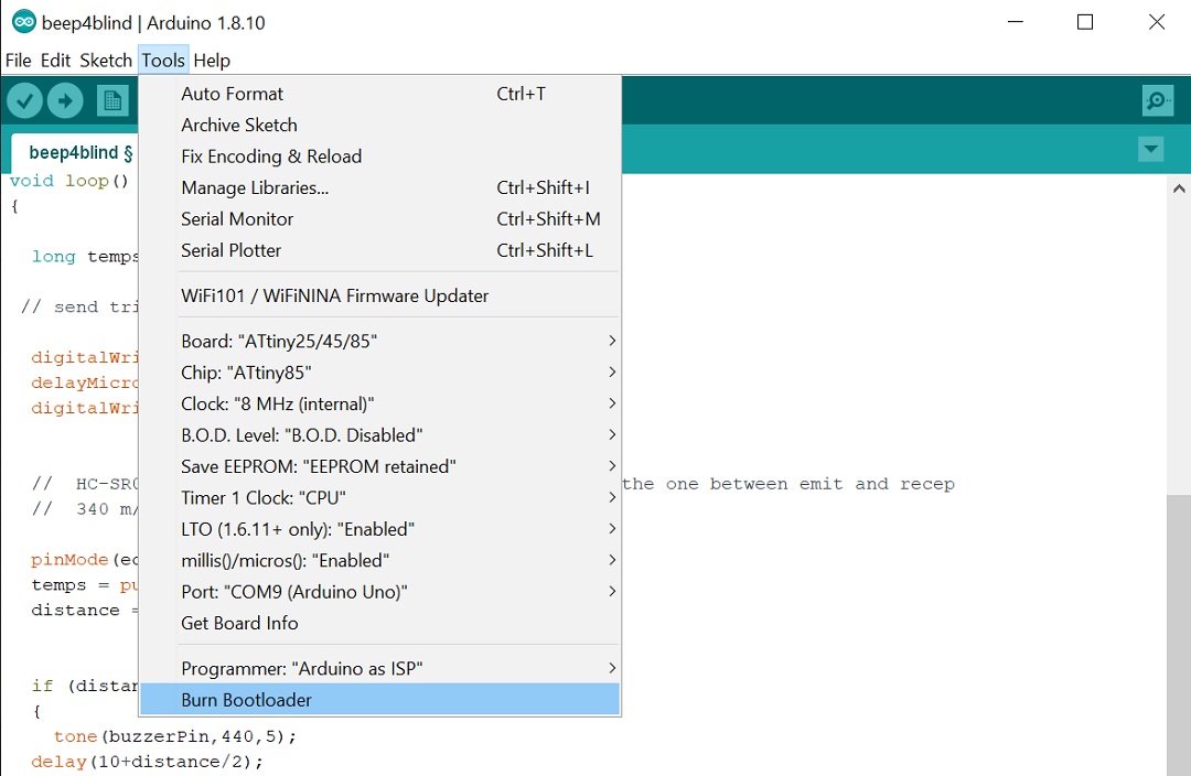 Now Under Tools menu you can select ATtiny25/45/85 for Board, then ATtiny85 for the chipset , the clock here 8Mhz internal, and do not forget to select Programmer:"Arduino as ISP"